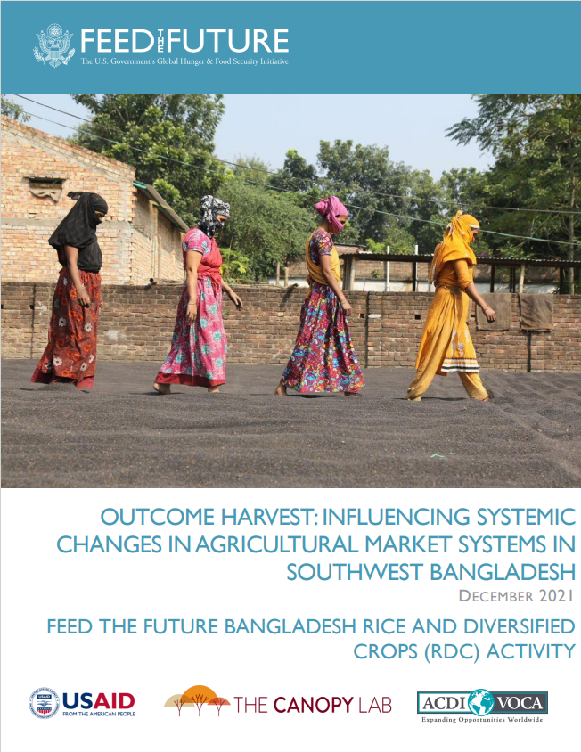 The study found that RDC played a significant role (and in some instances is solely responsible) in the emergence of many consequential changes in the performance of agricultural market systems in Southwest Bangladesh. No effort at systemic change is completely free of negative consequences. The study team found that at least two negative outcomes (supply constraints hampering the marketing of new products and digital illiteracy threatening to exclude some marginalized groups) pertained to its work. However, aside from those two outcomes, the 10 positive outcomes identified through this OH tell a larger story of significant boosts in the dynamism, information flow, and growth rates of firms serving farmers in the Activity’s target market systems.